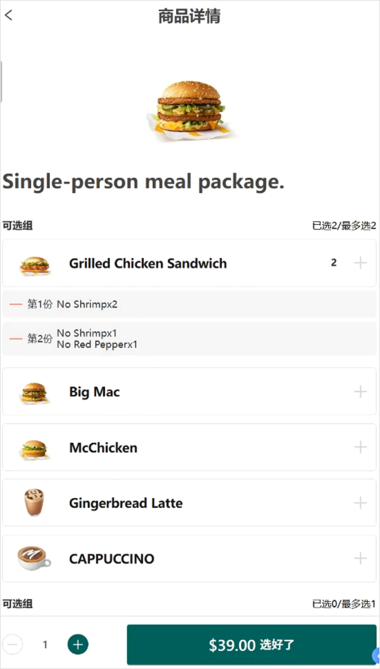 套餐子菜品与做法支持数量选择。例如同一套餐中,可选择 2 份相同商品(如 2 杯可乐),提升套餐配置灵活度。