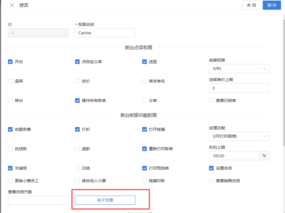 11. 收银后台,员工权限页面新增电子发票