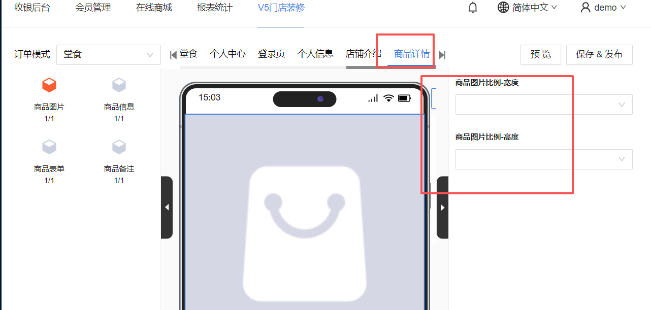 6. 门店装修,增加商品详情页装修(增加套餐必须选完再下单设置、商品图片比例设置)