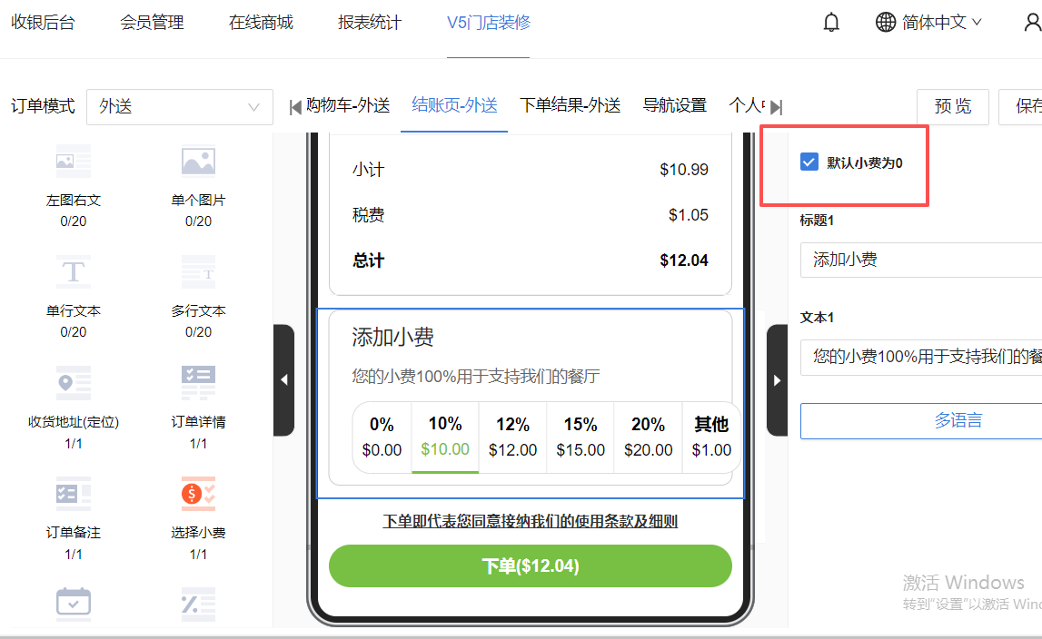 13. 门店装修,结账页小费容器增加默认小费为0设置