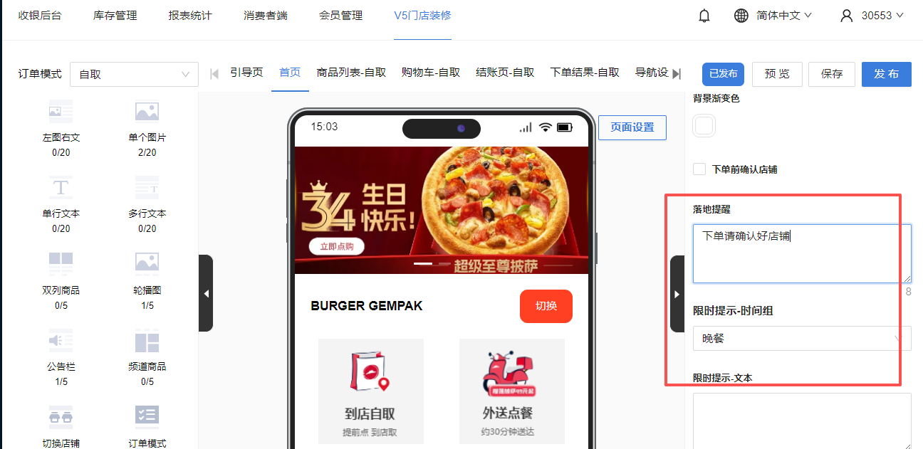 17. 门店装修,支持设置首页落地提醒、限时提醒