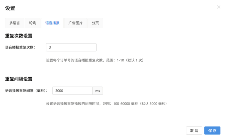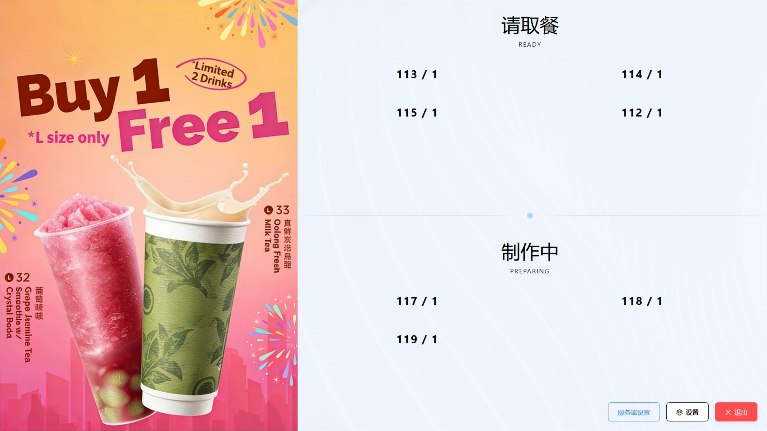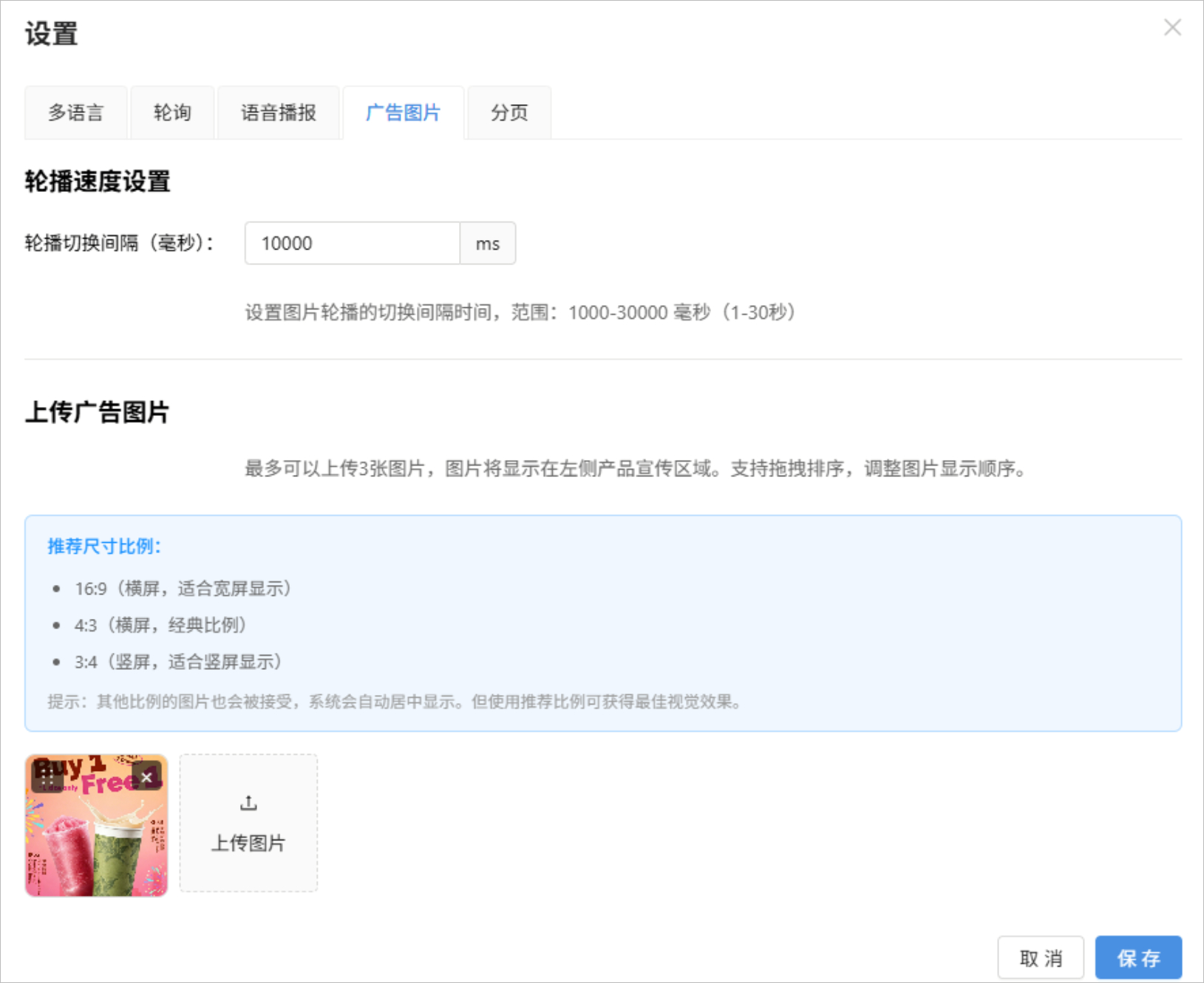 支持智能语音播报与多语言显示,可根据门店需求设置不同语言的取餐信息展示与播报方式,适用于国际化及多语言经营场景。同时,取餐叫号界面支持自定义广告图展示,帮助商家进行品牌宣传与活动推广。